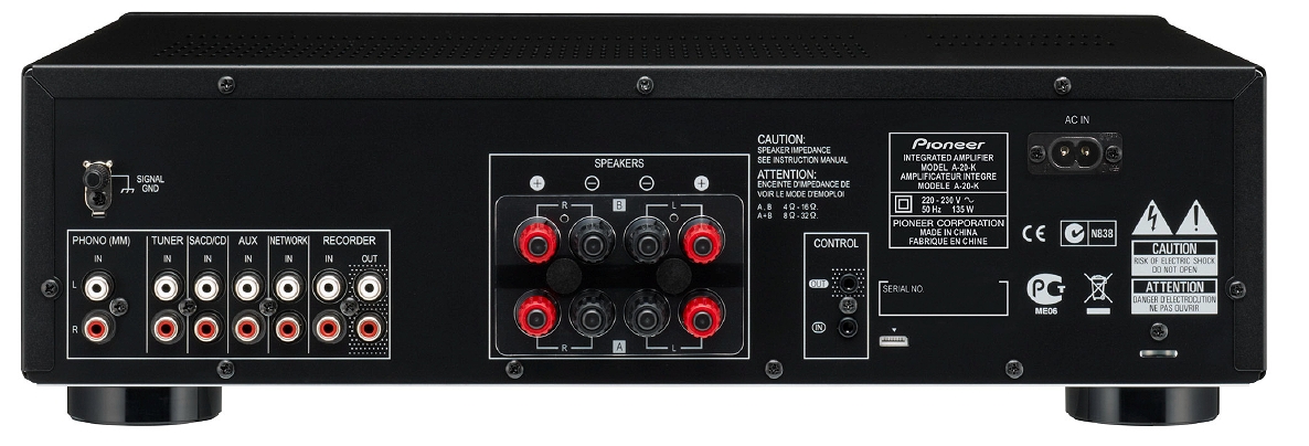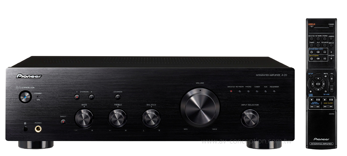 PIONEER A-20 ELITE ●50W+50W (20Hz-20kHz, THD 0.1%,4Ω) ●30W+30W (20Hz-20kHz, THD 0.05%,4Ω) ●頻率響應 ◇SACD/CD、NETWORK、TUNER、AUX、RECORDER…5Hz-100kHz 0db/-3db ◇PHONO……20Hz-20kHz ±0.5db ●負載阻抗:4-16Ω(A、B)﹑8–32Ω(A+B)﹑4–16Ω(Bi-Wiring) ●訊噪比 ◇SACD/CD﹑NETWORK﹑TUNER﹑AUX﹑RECORDER…………102db ◇PHONO(MM)………………………………………………77db ●電源需求 : 110V,50Hz/60Hz ●待機功率 : 0.3W ﹑消耗功率 :135W ●尺寸 :435mm(W)x128mm(H)x360mm(D) 重量 :7.2kg (本體) 接續端子 : ●類比輸入端子(PHONO(MM)﹑TUNER﹑SACD/CD﹑AUX﹑NETWORK﹑RECORDER) ●輸出端子(RECORDER﹑PHONE) ●SR輸入/輸出 ●電源插孔