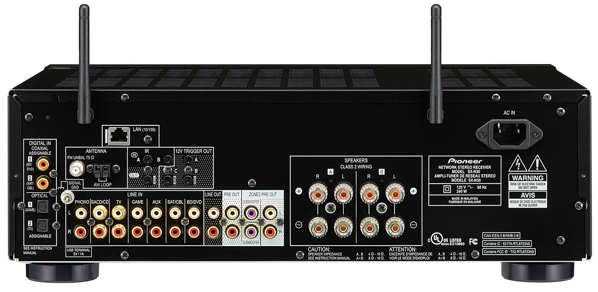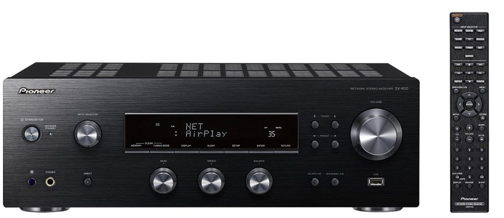 型號:Pioneer SX-N30 網路數位串流立體聲擴大機 《擴大機型式》 擴大機設計:Direct Energy 直接能量設計 分離式類比二聲道擴大機 大型EI變壓器 & 雙8,200µF電容 搭載 德儀TI Aureus™ DSP (DA830) 數位引擎核心, 提供Network及數位音訊處理 每聲道80W輸出功率 (8Ω,20~20kHz,THD 0.1%, 2ch驅動FTC) 鋁質前面板 橢圓形抗振底板機殼結構 鍍金類比/數位輸入端子 (Phono MM,SACD/CD,TV,GAME,AUX,SAT/CBL,BD/DVD,COAXIAL) 鍍金類比音訊輸出端子 (LINE,PRE, ZONE2 PRE) A/B組喇叭輸出切換 & 鍍金香蕉插喇叭端子