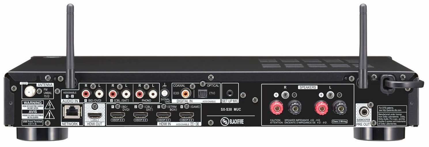 規格及端子 > 前方面板端子 * USB 輸入 (對應FAT16/32) * PHONES 耳機輸出 > 後方面板端子 * HDMI輸入x 4組 (1-4組可指定) * HDMI輸出x 1組 * USB 輸入 (對應FAT16/32) * Ethernet 網路輸入 * AV (複合) 輸入x 2 (可指定) * Phono (MM) 輸入x 1 * 數位同軸 (Coaxial) 輸入x 1 (可指定) * 數位光纖 (Optical) 輸入x 1 (可指定) * 大型喇叭輸出端子 * FM 天線 * MCACC 設定麥克風 輸入