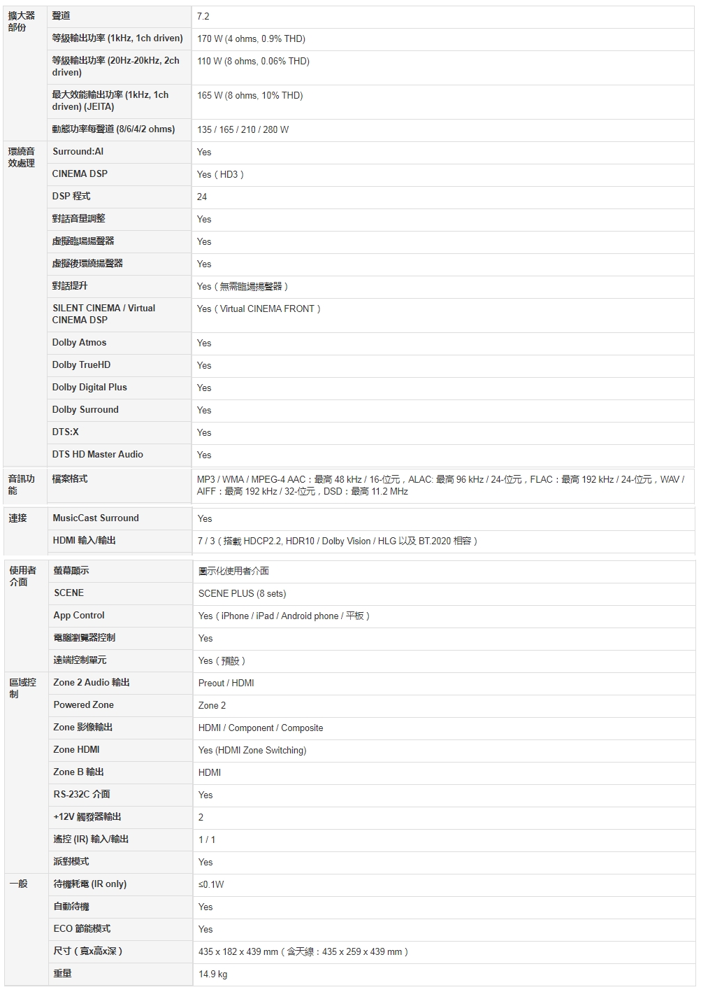 — 每聲道 165 W (8 ohms, 1 kHz, 10% THD, 1-ch driven)
